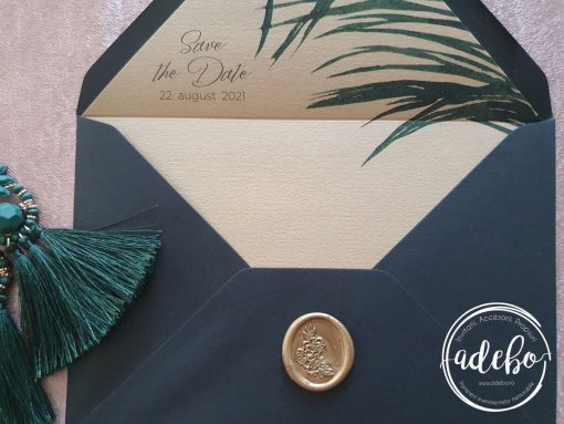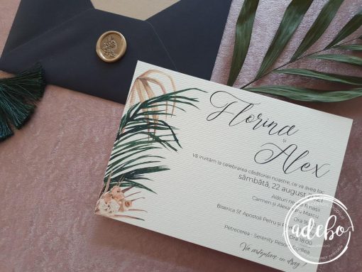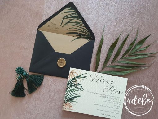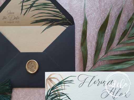 Astazi va prezentam un nou model ce-l adaugam in magazinul online cu invitatii de nunta Adebo Design – Invitatie nunta Areca Palm Black – Invitatia de nunta format landscape, design simplu cu cateva frunze de areca, print pe carton texturat ivoire, plic negru cu interior personalizat pe un carton cappuccino si sigiliu oval bronz cu imprimeu floral. Putem schimba culoarea la plic, la sigiliu – avem o gama variata de culori disponibile, cat si tiparul poate fi pe alt tip de carton daca nu il preferati pe acesta. Putem oferi si invitatia digitala / invitatia electronica.