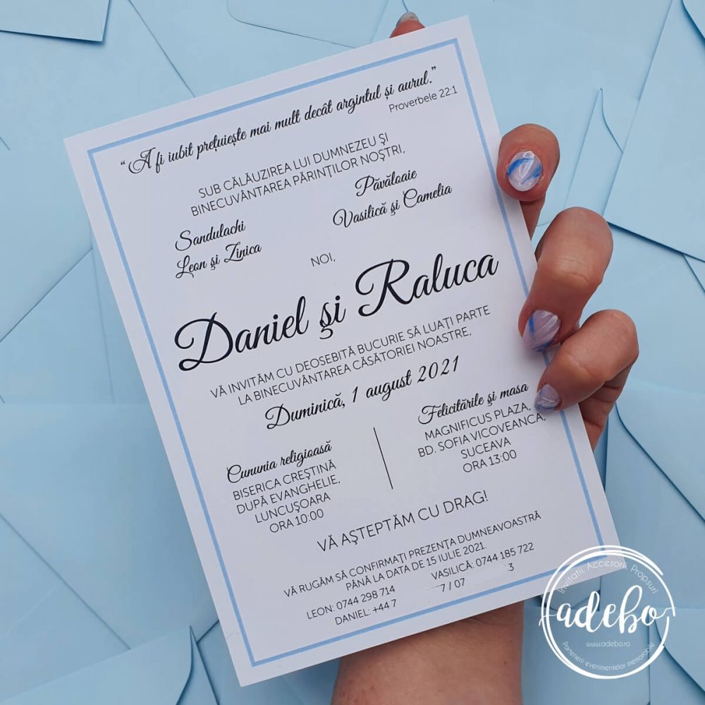 Astazi va prezentam un nou model ce-l adaugam in magazinul online cu invitatii de nunta Invitatia de nunta Simply blue – invitatie de nunta minimalista, invitatii de nunta cu albastru pastel, invitatie de nunta personalizata, invitatie de nunta cu plic albastru pastel, print digital pe carton mat 300 gsm. Putem oferi si invitatia digitala / invitatia electronica.