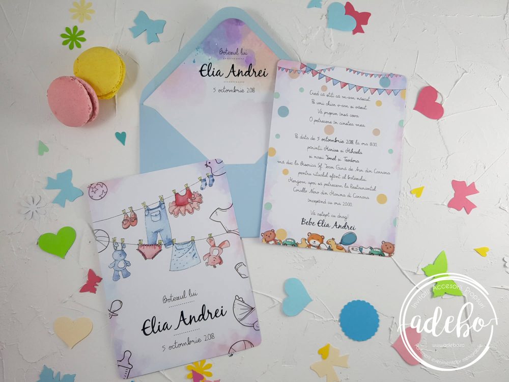 Astazi va prezentam un nou model ce-l adaugam in magazinul online cu invitatii de botez Adebo Design – Invitatie botez Baietel – Watercolor, o invitatie jucausa in nuante predominante de albastru, o invitatie de botez cu personaje animate, cu buline si stegulete colorate, fundal watercolor si plic albastru cu interior personalizat.