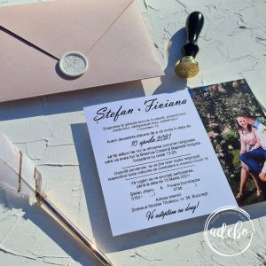 Astazi va prezentam un nou model ce-l adaugam in magazinul online cu invitatii de nunta Invitatie de nunta Fiviana – invitatie de nunta cu poza, invitatii de nunta cu plic roz pastel / roz gold, invitatie de nunta personalizata, invitatie de nunta cu sigiliu de ceara personalizat cu initiale, print digital pe carton mat 300 gsm. Stampila personalizata cu initiale se face pe comanda si are cost extra. Putem oferi si invitatia digitala / invitatia electronica.