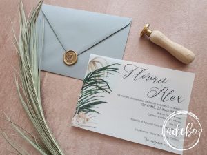 Astazi va prezentam un nou model ce-l adaugam in magazinul online cu invitatii de nunta Invitatie nunta Areca Palm Grey – format landscape, design simplu cu cateva frunze de areca, print pe carton translucid, plic gri si sigiliu bronz format oval. Putem oferi si invitatia digitala / invitatia electronica.