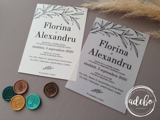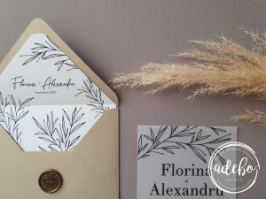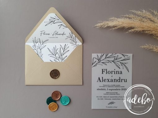 Astazi va prezentam un nou model ce-l adaugam in magazinul online cu invitatii de nunta Adebo Design – Invitatie nunta carton translucid – o invitatie pentru nunta cu tematica crengute, invitatii nunta cu ramurele, invitatie de nunta ivory – tiparita digital pe carton translucid (vellum) de 300 grame. La acest model de invitatie am ales sa folosim un plic realizat manual de culoare auriu regal cu liner personalizat, iar efectul maxim a fost dat de acel sigiliu de ceara culoare bronz cu inscriptia „with love”, ce inchide plicul. Putem oferi si invitatia digitala / invitatia electronica.