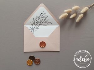 Astazi va prezentam un nou model ce-l adaugam in magazinul online cu invitatii de nunta Adebo Design – Invitatie nunta cu plic sampanie – o invitatie pentru nunta cu tematica crengute – coroana din crengute, invitatii nunta tematica minimalista, invitatie de nunta cu sigiliu de ceara – tiparita digital pe carton reciclat de 300 grame. La acest model de invitatie am ales sa folosim un plic sampanie realizat manual cu interior de plic personalizat in aceeasi tematica si trebuie sa recunoastem ca s-au potrivit de minune, iar efectul maxim a fost dat de sigiliul de ceara bronz cu model crengute ce inchide plicul. Putem oferi si invitatia digitala / invitatia electronica.