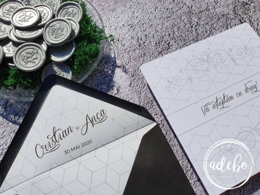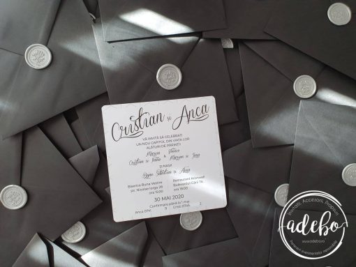 Astazi va prezentam un nou model ce-l adaugam in magazinul online cu invitatii de nunta Adebo Design – Invitatie nunta Gray Lines – o invitatie pentru nunta cu tematica minimalista, invitatii nunta cu plic negru si sigiliu, invitatie de nunta simpla cu sigiliu – tiparita digital pe carton mat de 300 grame. La acest model de invitatie am ales sa folosim tipar pe carton mat soft touch si inchiderea se face cu un sigiliu de ceara argintiu, culoare si model la alegerea dvs. Putem oferi si invitatia digitala / invitatia electronica.