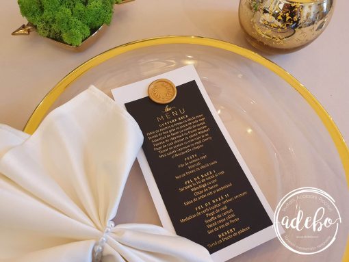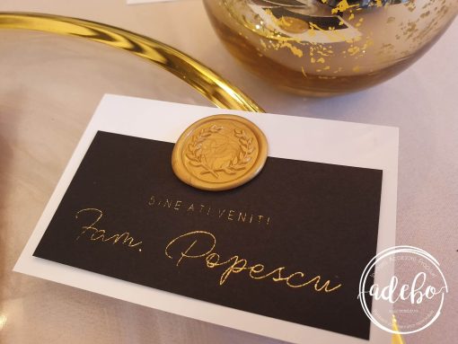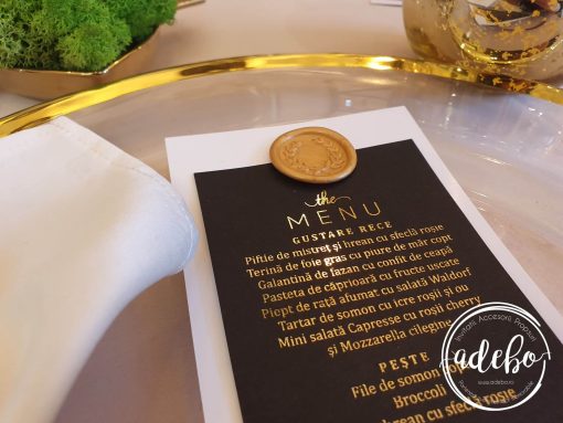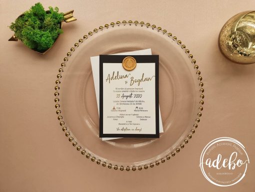 Astazi va prezentam un nou model ce-l adaugam in magazinul online cu invitatii de nunta Adebo Design – Invitatie nunta Luxury Gold si dupa cum numele ii este, sigur v-ati dat seama ca vorbim despre o invitatie pentru nunta cu tematica gold, scris auriu, invitatie de nunta tiparita digital pe carton lucios de 300 grame, baza este din carton negru de 160 grame. Cartonul principal are textul auriu si este prins de cartonul de baza cu un sigiliu de ceara auriu. In loc de auriu, putem sa mai punem argintiu sau rose gold iar culoarea la sigiliul de ceara poate sa difere, in functie de preferintele clientului. Daca sunteti in cautare de invitatii de nunta cu folio auriu, folio argintiu, folio rose gold, invitatii de nunta premium cu auriu, invitatii de nunta cu sigiliu – ne puteti contacta.