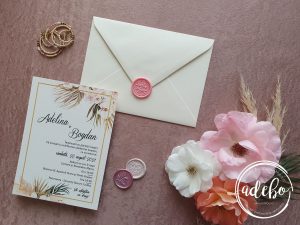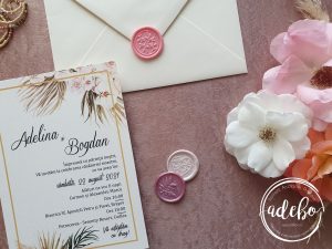 Astazi va prezentam un nou model ce-l adaugam in magazinul online cu invitatii de nunta Adebo Design – Invitatie nunta Orhideea – design floral cu aranjament din trandafiri, orhidee si frunze de palmier, print pe carton de bumbac, plic ivoire si sigiliu roz. La acest model am optat la un design dragut cu orhidee si trandafiri rozalii, singurul accesoriu adaugat este sigiliul. Putem schimba culoarea la plic, la sigiliu – avem o gama variata de culori disponibile, cat si tiparul poate fi pe alt tip de carton daca nu il preferati pe acesta. Putem oferi si invitatia digitala / invitatia electronica.