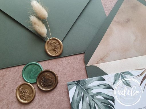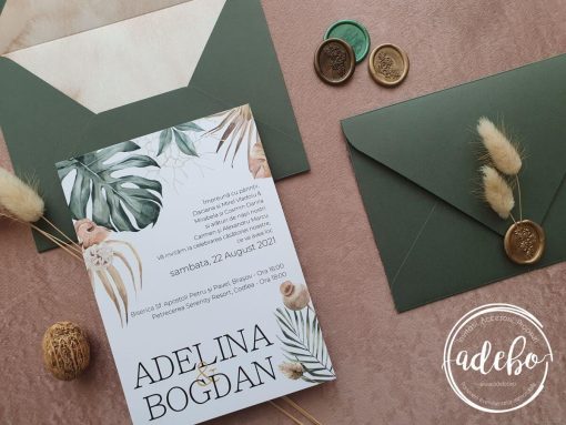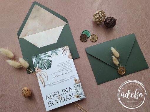 Astazi va prezentam un nou model ce-l adaugam in magazinul online cu invitatii de nunta Adebo Design – Invitatie nunta Palm Leaf – design cu frunze tropicale, print pe carton alb mat, plic verde inchis realizat manual cu un liner watercolor si sigiliu oval bronz cu flori uscate de Lagurus. Aceasta este prima invitatie din noua noastra colectie de invitatii „Pampas & Tropical”. Putem oferi si invitatia digitala / invitatia electronica.