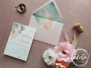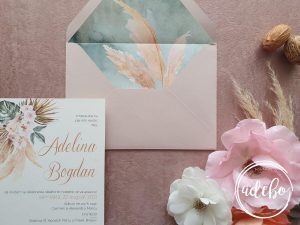 Astazi va prezentam un nou model ce-l adaugam in magazinul online cu invitatii de nunta Adebo Design – Invitatie nunta Pampas Grass – design dragut cu aranjament format din pampas, flori, frunze de monstera si palmier, print pe carton de bumbac ivoire, plic nude realizat manual cu insertie verde watercolor si pampas. Love this combo ❤. Putem oferi si invitatia digitala / invitatia electronica.