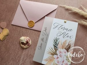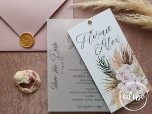 Astazi va prezentam un nou model ce-l adaugam in magazinul online cu invitatii de nunta Invitatie nunta Pampas & Orchid – design dragut cu aranjament format din pampas, orhidee si frunze de palmier, textul invitatiei este printat pe carton translucid iar aranjamentul pe carton alb si sunt prinse cu o capsa aurie, plic roz pudra realizat manual si sigiliu auriu. Suprapunerea celor doua cartoane diferite face invitatia sa fie mult mai speciala, este un model cu care sigur veti impresiona intr-un mod placut invitatii, este unica si diferita. Putem oferi si invitatia digitala / invitatia electronica.
