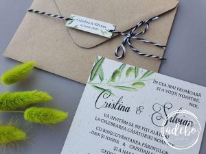 Astazi va prezentam un nou model ce-l adaugam in magazinul online cu invitatii de nunta Adebo Design – Invitatie nunta Recycled Olive – o invitatie pentru nunta cu tematica masline, invitatii nunta olive oil, invitatie de nunta greenery – tiparita digital pe carton reciclat de 300 grame. La acest model de invitatie am ales sa folosim un plic kraft maro, iar efectul maxim a fost dat de acel snur in doua culori si tag personalizat cu numele mirilor + data eveniment, ce inchide plicul. Putem oferi si invitatia digitala / invitatia electronica.