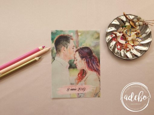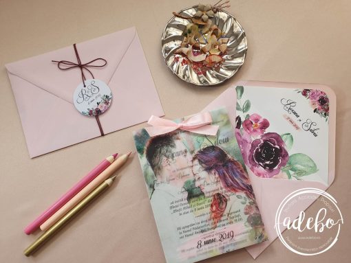 Astazi va prezentam un nou model ce-l adaugam in magazinul online cu invitatii de nunta Adebo Design – Invitatie nunta Roxa – o invitatie pentru nunta cu tematica florala mov, invitatie de nunta cu flori mov watercolor, invitatie de nunta cu caricatura – tiparita digital pe carton lucios la baza si hartie translucida deasupra, legate impreuna cu o fundita de satin roz deschis la fel ca si plicul invitatiei. La acest model de invitatie am ales sa recomandam mirilor un plic roz pastel si trebuie sa recunoastem faptul ca s-au potrivit de minune, iar efectul maxim a fost dat de acea eticheta cu snur din jurul plicului. Da, depinde de gusturi acum si noi nu ne dorim decat sa ne adaptam cerintelor voastre. Ne spuneti ce buget aveti stabilit pentru invitatiile de nunta, pentru papetarie si va putem face o recomandare astfel incat sa fie pe placul dvs.