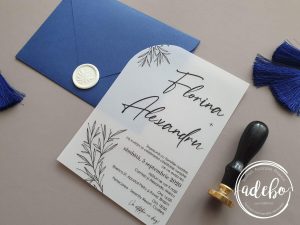 Astazi va prezentam un nou model ce-l adaugam in magazinul online cu invitatii de nunta Adebo Design – Invitatie nunta Vellum Blue – o invitatie pentru nunta cu tematica minimalista, invitatii nunta cu crengute, invitatie de nunta translucida – tiparita digital pe carton vellum de 300 grame. La acest model de invitatie am ales sa folosim un plic realizat manual de culoare albastru royal, iar efectul maxim a fost dat de acel sigiliu de ceara alb care asigura inchiderea ferma a invitatiei. Putem oferi si invitatia digitala / invitatia electronica.