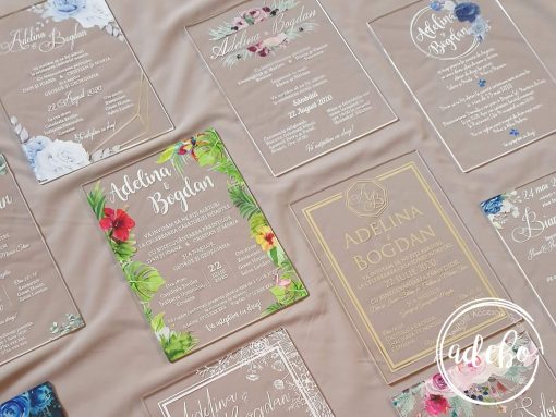 Sunteti in cautare de Invitatii nunta plexiglas, invitatii nunta acril, invitatii tiparite pe acril, invitatii nunta transparente? Atunci trebuie sa colaboram, deoarece incepand cu acest an realizam invitatii de nunta sau invitatii de botez personalizate pe material plexiglas / acril / material transparent. Adaugam in portofoliu prima noastra invitatie de acest gen si o numim „Invitatii nunta plexiglas – White Gray” – invitatie de nunta simpla, eleganta, cu print floral cu cerneala alba pe plexiglas insotita fiind de un plic gri deschis pe care il putem accesoriza cu un sigiliu de ceara, pentru un efect mai intens. Culoarea la plic poate fi schimbata. Avem pe stoc multe modele de stampile pentru sigiliile de ceara. Contactati-ne pentru mai multe detalii.