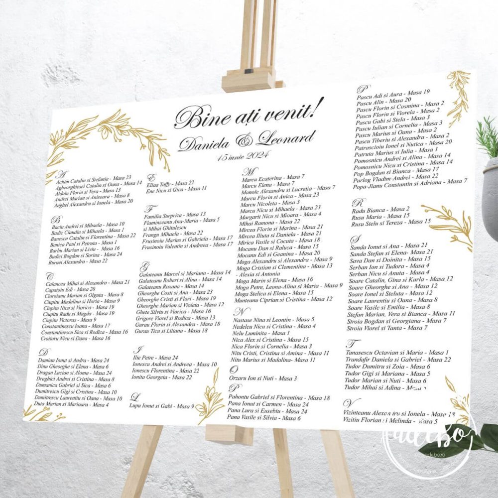 Pe site-ul nostru puteti comanda produsul „Lista invitati elemente aurii” – Opis nunta personalizat, model ce se potriveste evenimentului dumneavoastra daca aveti ca tematica nunta gold, elemente aurii, nunta minimalista gold, frunze si crengute aurii. Putem realiza model nou de lista invitati astfel incat sa se potriveasca evenimentului, la cererea clientului.