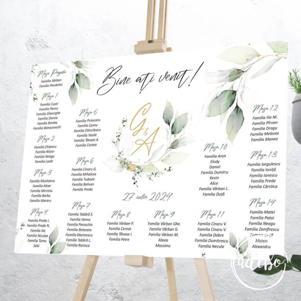 Pe site-ul nostru puteti comanda produsul „Lista invitati green & gold” – Opis nunta personalizat, model ce se potriveste evenimentului dumneavoastra daca aveti ca tematica la nunta verdeata multa, frunze de eucalipt, frunze verzi si elemente aurii. Putem realiza model nou de lista invitati astfel incat sa se potriveasca evenimentului, la cererea clientului.
