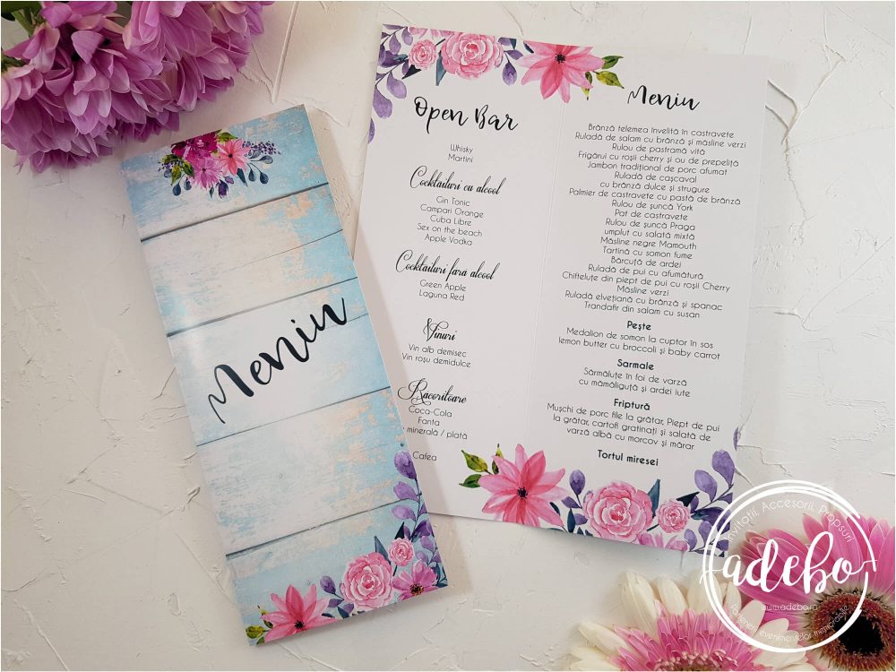 Meniu nunta Ella – meniu nunta vintage, meniu nunta chabby chic printat pe carton gros de 300 grame, fundal din lemn scorojit cu flori roz si mov. Interiorul meniului este impartit in doua categorii: meniu bauturi open bar si meniu mancare. Accesoriile din acest pachet sunt realizate in aceeasi grafica: numar masa, plic bani, invitatie si desigur meniul. Meniul poate fi personalizat dupa cerintele voastre, nu exista taxe suplimentare. Culorile se pot schimba, fontul, bineinteles textul dar si formatul acestuia. Putem face meniuri tip turn de 10×25 cm (sau alte dimensiuni preferate) cat si meniuri tip triunghi cu trei fete. Ne putem adapta cu usurinta la tematica evenimentului, si facem tot posibilul ca rezultatul final sa fie peste asteptari. Pentru alte detalii, va stam la dispozitie.