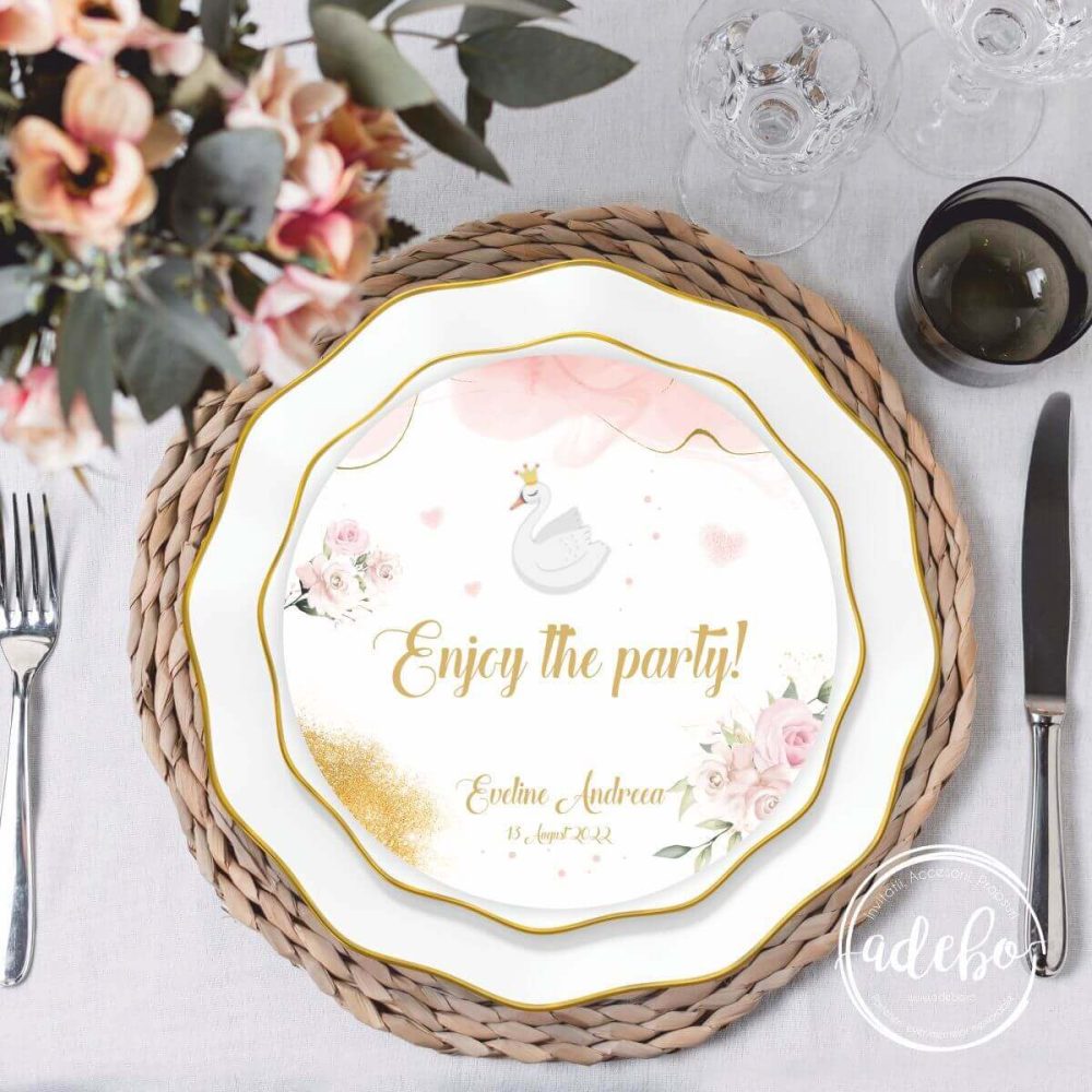 Pe site-ul nostru puteti comanda produsul „Welcome card – lebada regina”, model card de farfurie pentru botez, model cerc – se potriveste evenimentului dumneavoastra daca aveti ca tematica la botez trandafiri roz, flori pale, aranjament floral in nuante pale, roz pudra, gold, lebada. Pe comanda, poate fi meniu cerc sau putem realiza model nou de meniu / design meniu / grafica meniu nou astfel incat sa se potriveasca evenimentului, la cererea clientului.